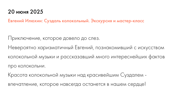 10 лет опыта экскурсий с колокольными звонами, являюсь автором и основоположником колокольных экскурсий в Суздале.