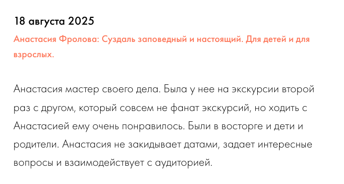 Это обзорная экскурсия по главным достопримечательностям города в формате беседы. Вы погружаетесь в историю Суздаля, разговаривая. Есть два формата - более взрослый, с Александром. И детский с Анастасией. Знакомство с главными достопримечательностями и центральными линиями в истории разбавлено загадками и необычными фактами.