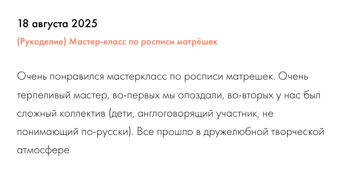Приглашаю Вас на мастер-класс по росписи матрёшек. На занятии каждый участник сможет расписать уникальную, единственную в своём роде авторскую матрешку. Предлагаю на выбор различные заготовки, для начинающих рисовальщиков есть заготовки с уже нанесенным рисунком, для продвинутых - пустые заготовки, на которых можно изобразить абсолютно любые темы. При необходимости и возможности помогаю реализовать ваши фантазии. На занятии каждому участнику накрывается персональное рабочее место и предоставляются все материалы. Помимо объяснения о технике нанесения красок Вас ожидает рассказ о истории появления матрёшки, различных народных росписях и о том, как производятся матрёшки. Каждый участник после занятия забирает с собой полностью готовую работу.