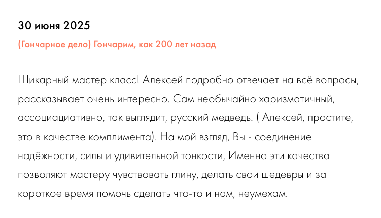Мастер-класс проходит в сохранившейся избе 18 века зимой и во дворе этого дома (под крышей) летом, на ножном гончарном кругу. Алексей проведет небольшой экскурс в профессию, расскажет о ее возникновении и трансформации в современном мире. Не стесняйтесь задавать вопросы - знания у него очень глубокие. При желании можно узнать все тонкости гончарного мастерства. После этого вы сами попробуете скрутить изделие (горшочек или вазочку) на ножном гончарном кругу. Без электричества, толкая его ногой. Сырье для мастер-класса - белая каолиновая глина, которую мастер добывает собственноручно. После изделие можно забрать (лучше когда подсохнет, например, на следующий день, но можно и сразу). Или договориться с Алексеем об обжиге и пересыле СДЭКом. Мастер-класс больше индивидуальный, гончарный круг один. Если вас больше 4х человек, лучше разделиться на несколько групп, чтобы не ждать.