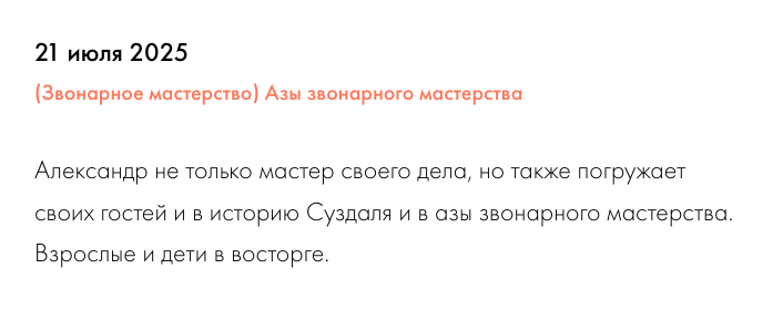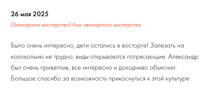 Мастер-класс колокольного звона включает в себя рассказ о традиции Православного колокольного звона с демонстрацией фрагментов разных звонов. Каждый участник мастер-класса имеет возможность получить первые навыки, изучить начальные приёмы колокольного звона. Мастер-класс проводится либо на колокольне действующего храма города, либо на звоннице, где происходит обучение будущих звонарей. Но учебная звонница более подходит для групп с детьми, так как удобна (имеются лавочки, стулья), безопасна и вмещает большее количество участников. На церковной колокольне проводятся мастер-классы исключительно до 10 человек. Более 10 человек - не при храме, а на учебной звоннице. Колокола там также освященные Суздальским иеромонахом Пантелеймоном, настоятелем Александровского монастыря. И место благословлено для проведения занятий.